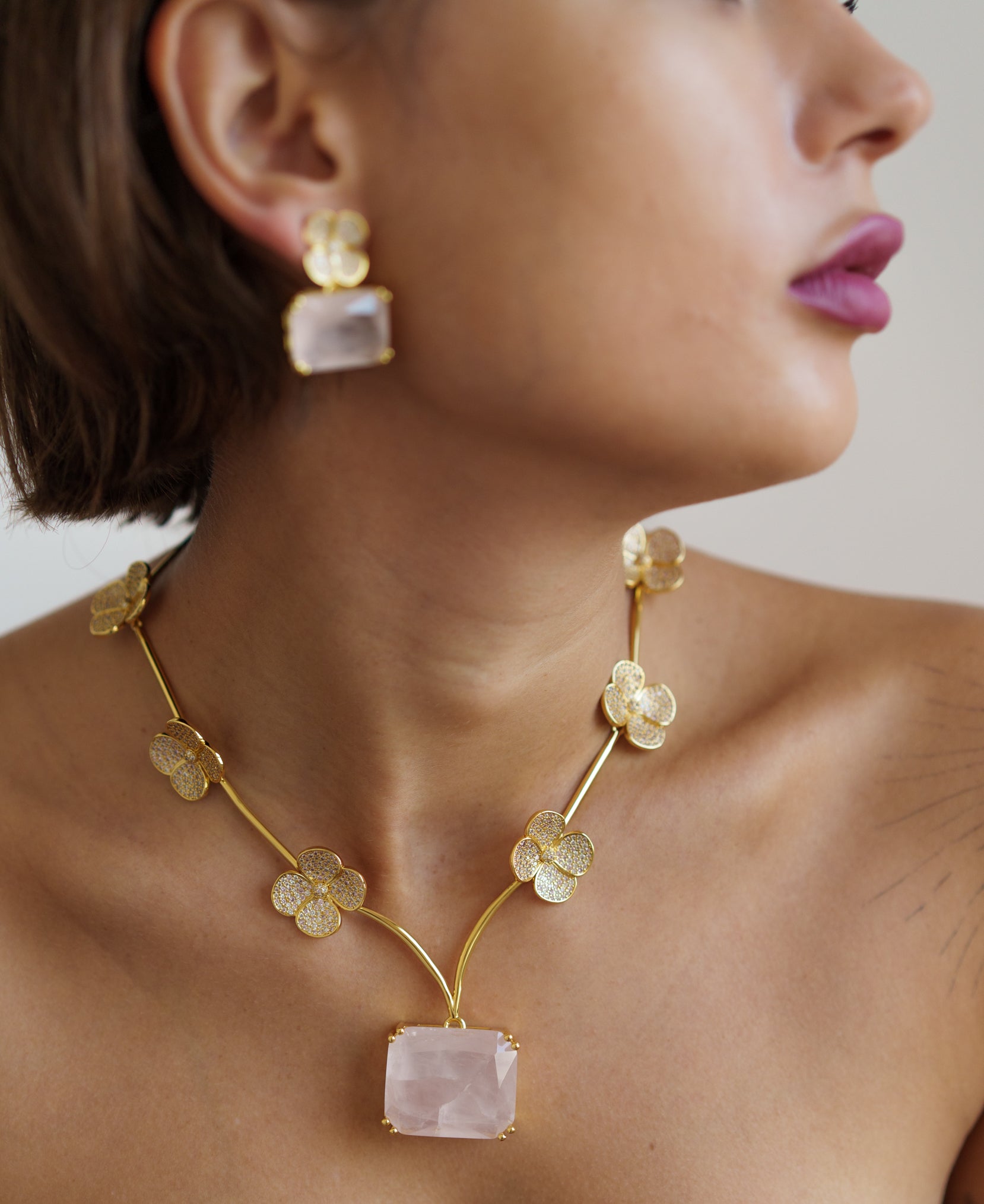 The Touch of Love Set is the perfect embodiment of elegance and romance. This charming set includes a necklace and earrings, both meticulously crafted from brass with 18K gold plating for a luxurious and distinctive finish. The necklace features a warm and delicate rose quartz centerpiece, symbolizing love and harmony, complemented by sparkling zircon stones in both pieces for unmatched brilliance. The earrings are elegantly designed and lightweight, ensuring comfort for daily wear or special occasions. This set is the perfect choice to add a sophisticated touch to your look.